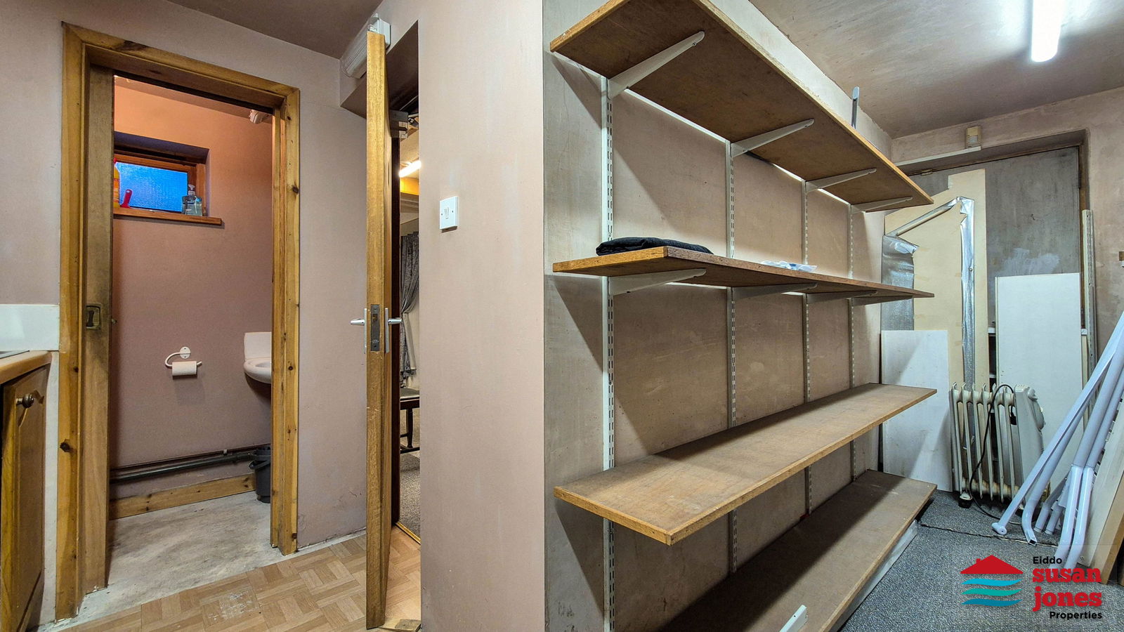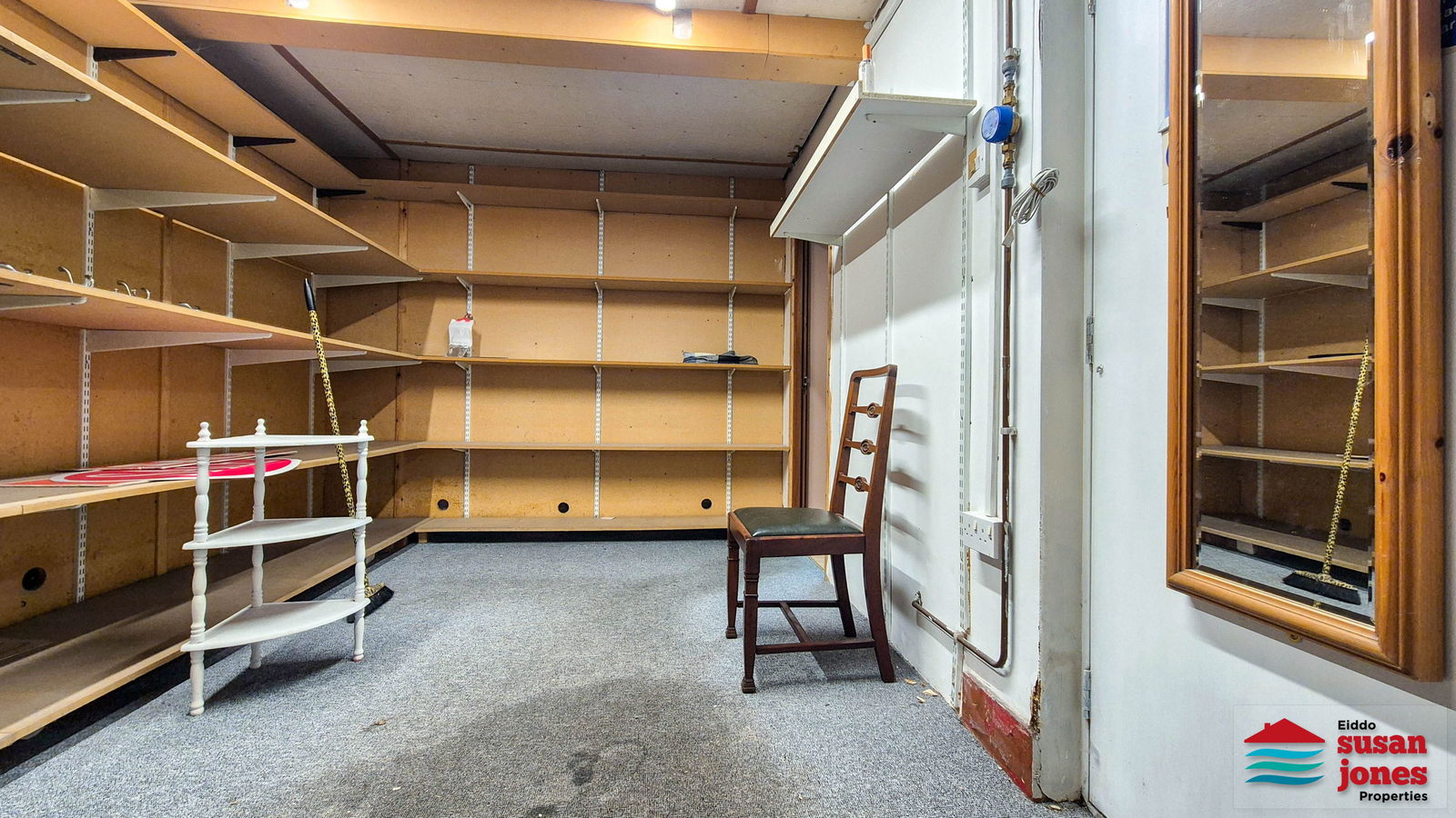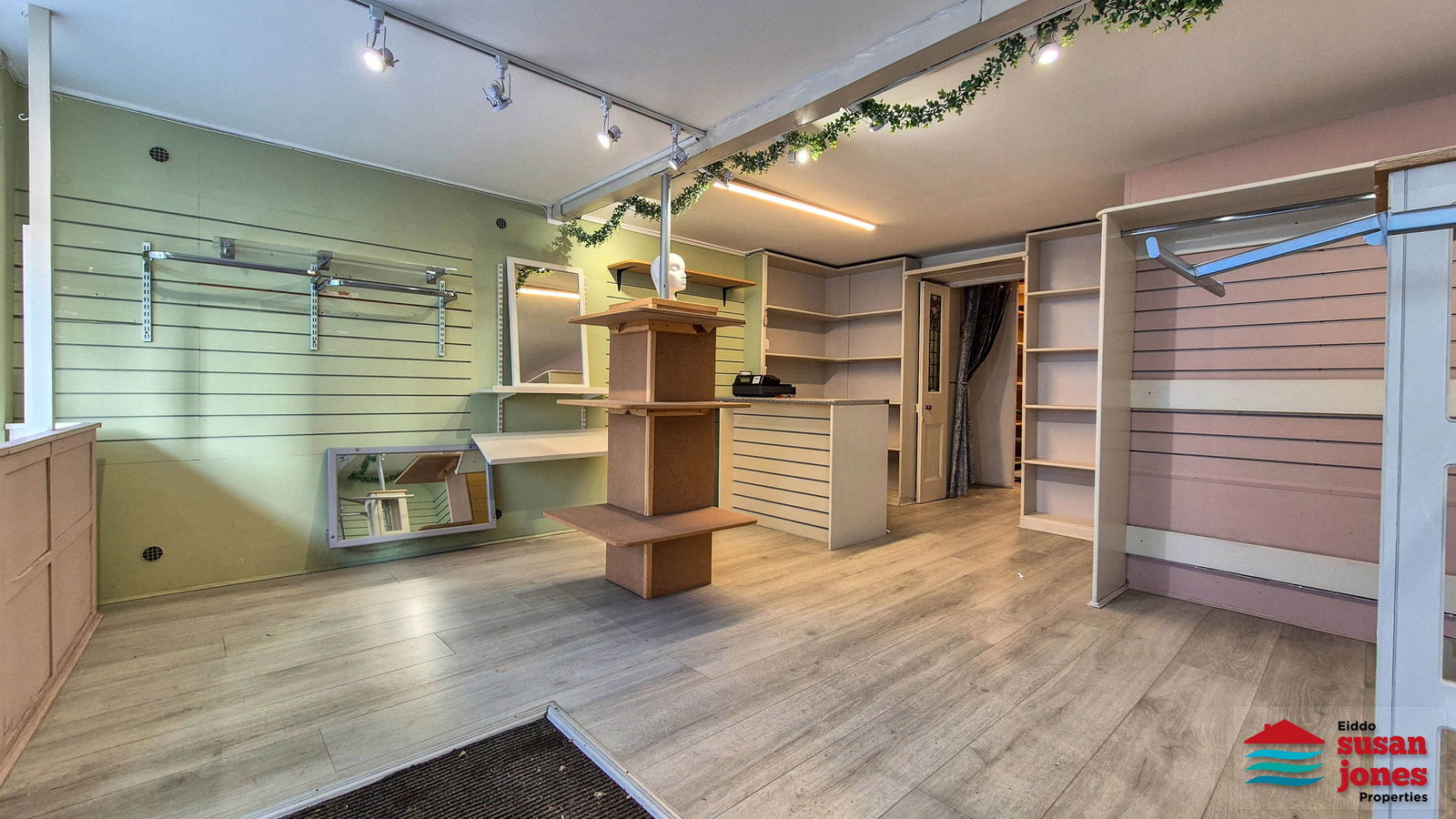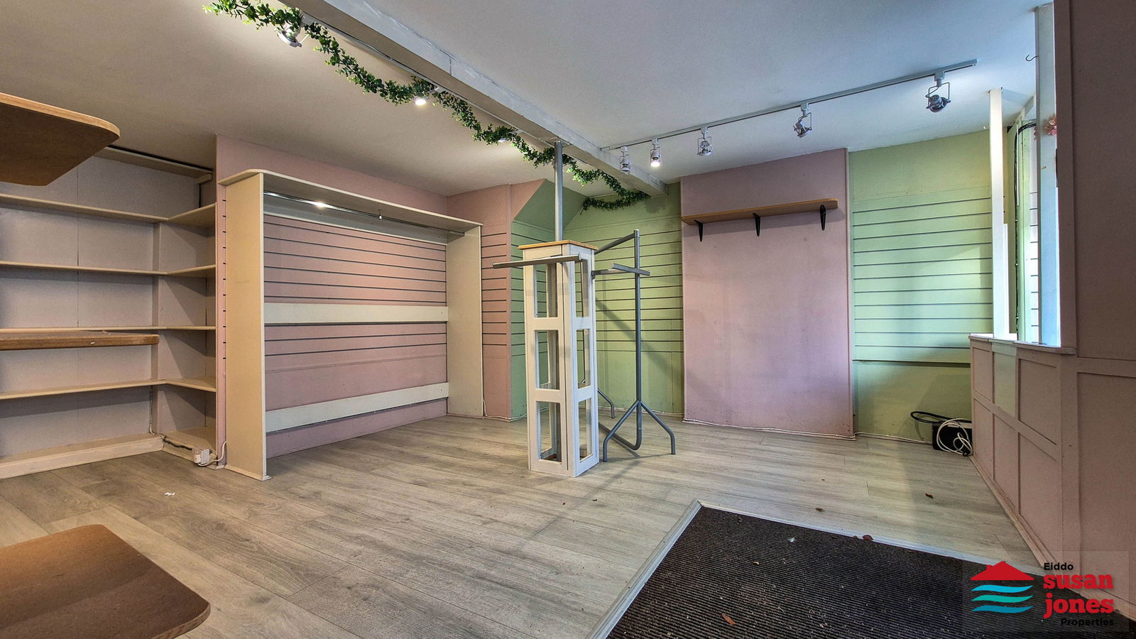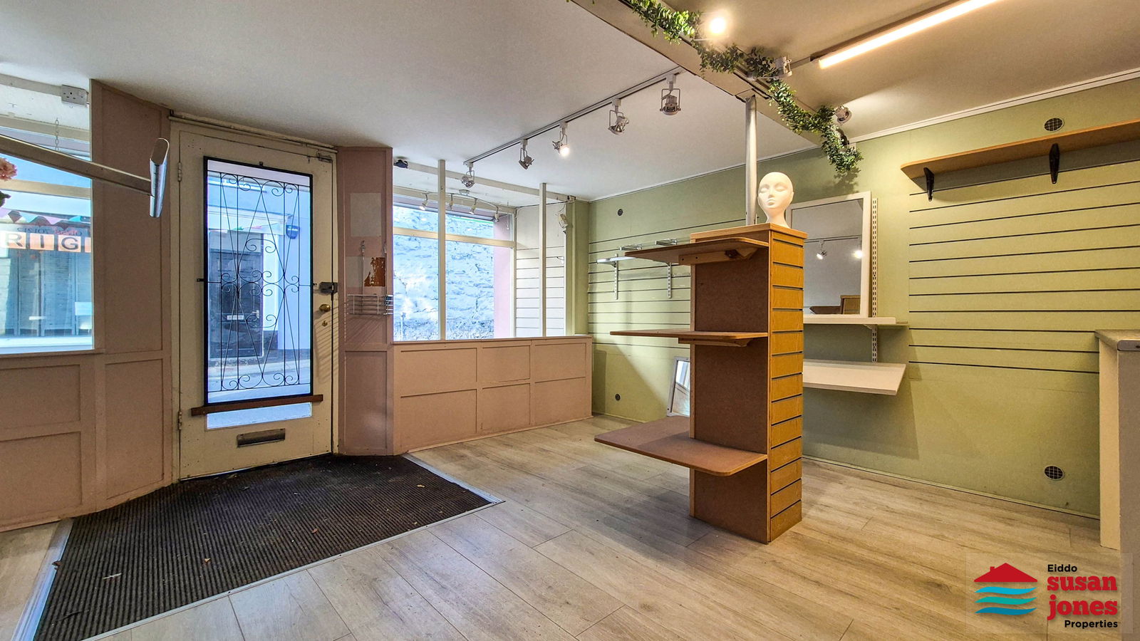 Siop gyda ffrynt dwbl ar y llawr gwaelod gydag ystafell ganol ynghyd ac ystafell gefn gyda sinc a thoiled. Llwybr ochr sydd yn rhoi mynediad i'r cefn.