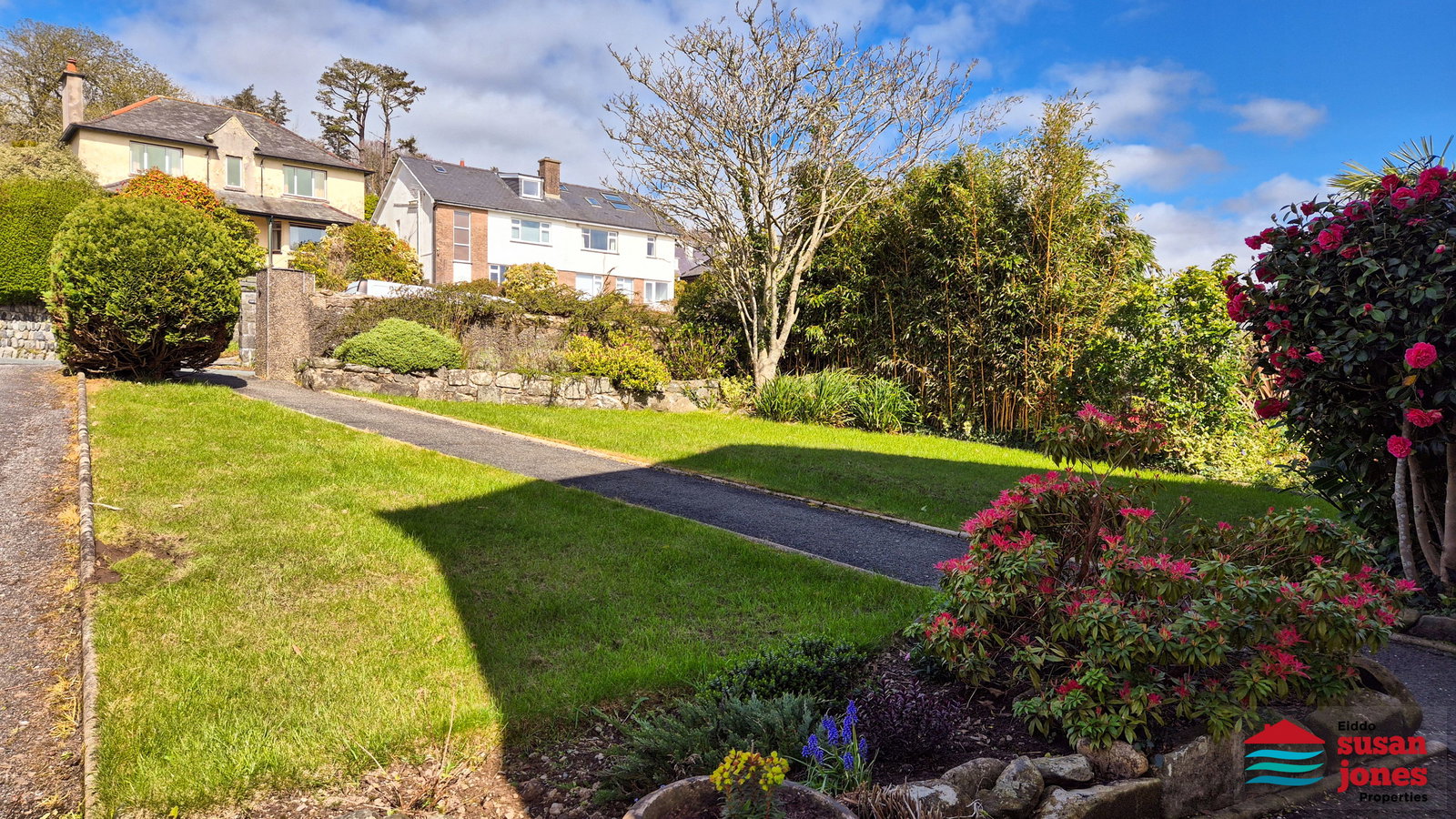 Front lawn with mature shrub borders. Enclosed rear garden with patio and lawn, ideal for outdoor seating and relaxation.