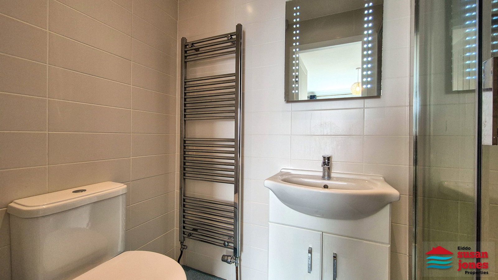 Shower cubicle with electric shower, WC., vanity unit with wash hand basin and storage under. Central heating towel rail, mirror with light.