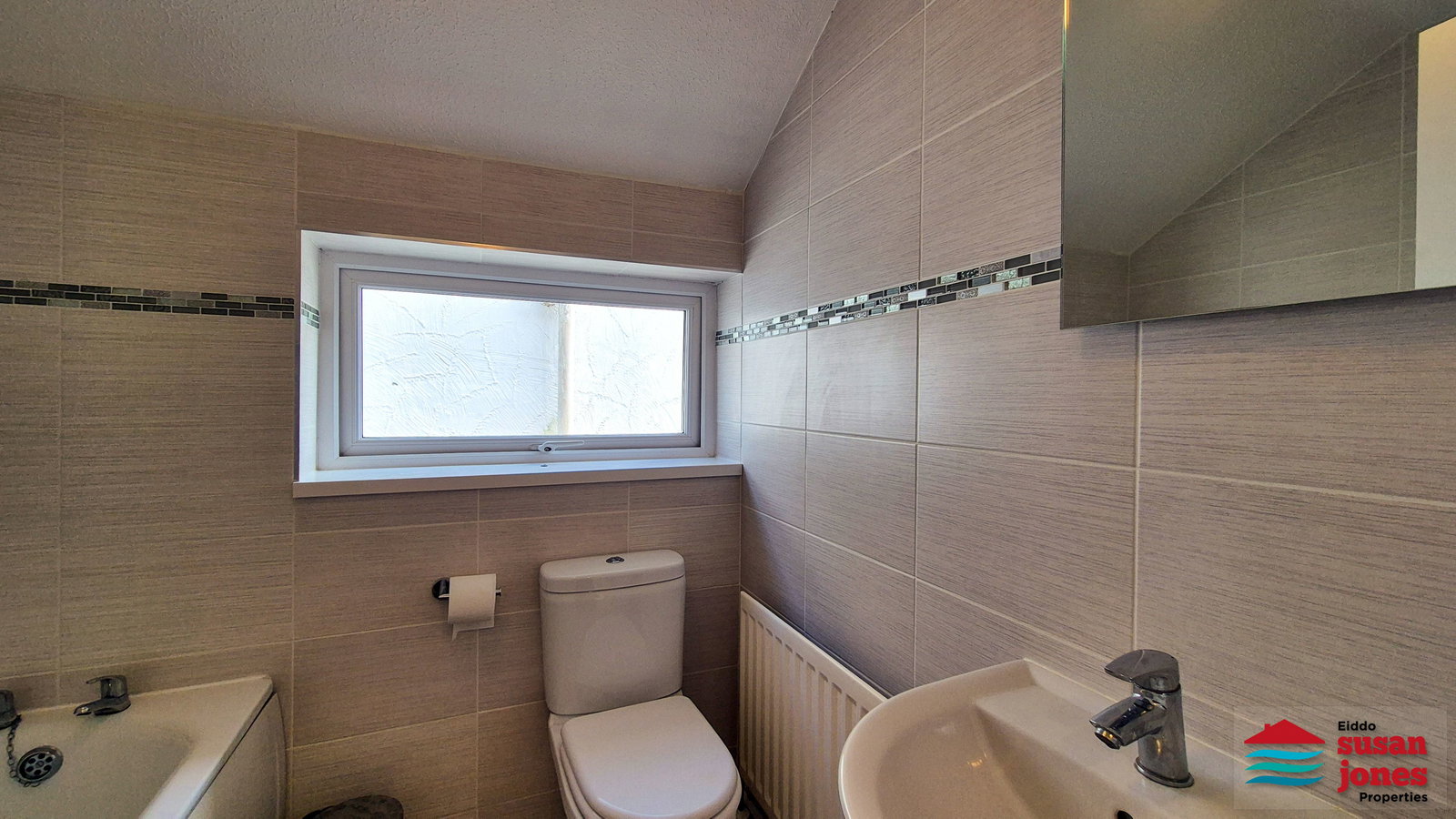 Panelled bath, WC and wash hand basin. Central heating radiator, mirror with light, uPVC double glazed window.
