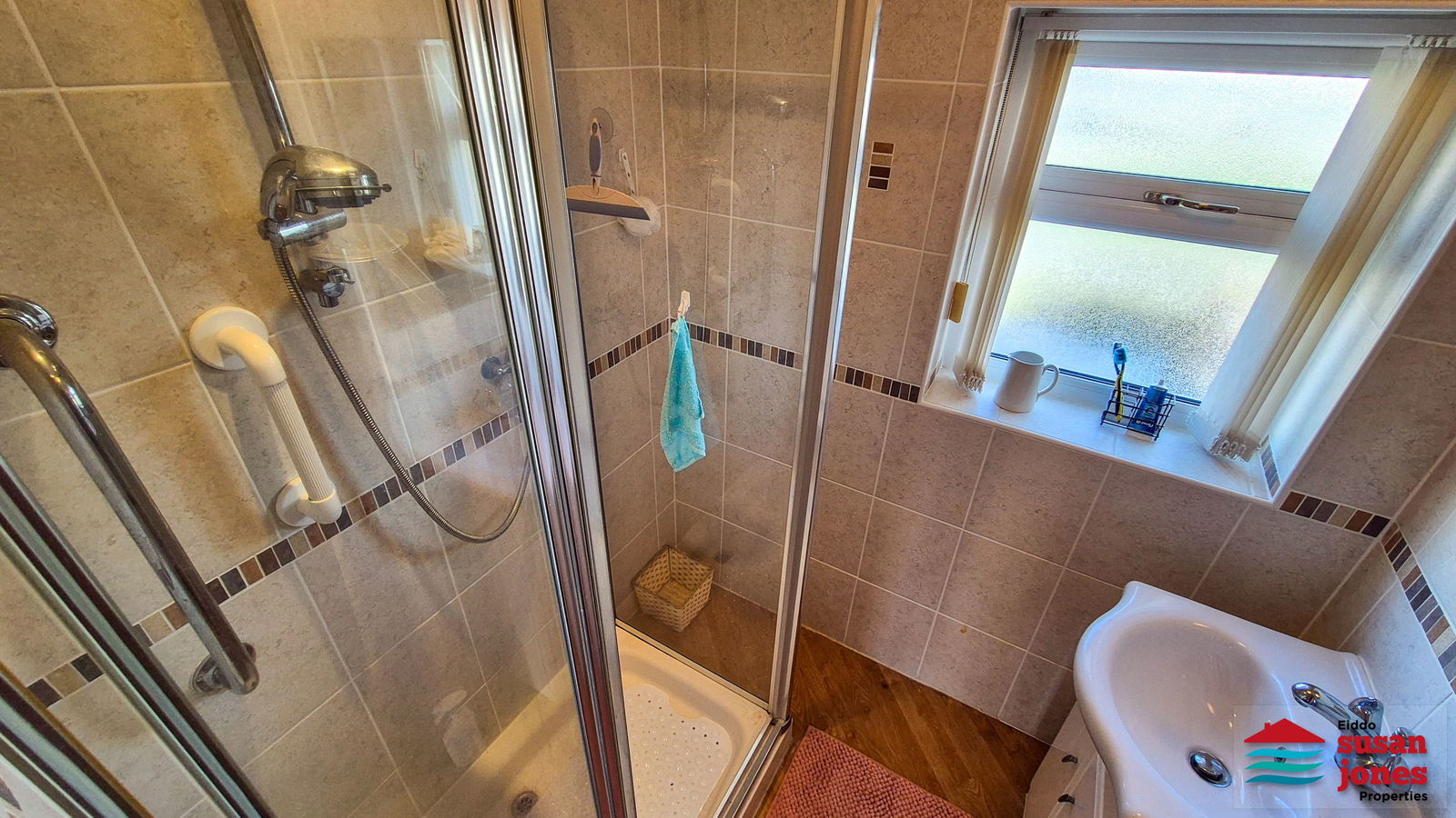 Modern suite with shower cubicle, vanity unit with washbasin and storage under. Towel radiator. UPVC double glazed window.