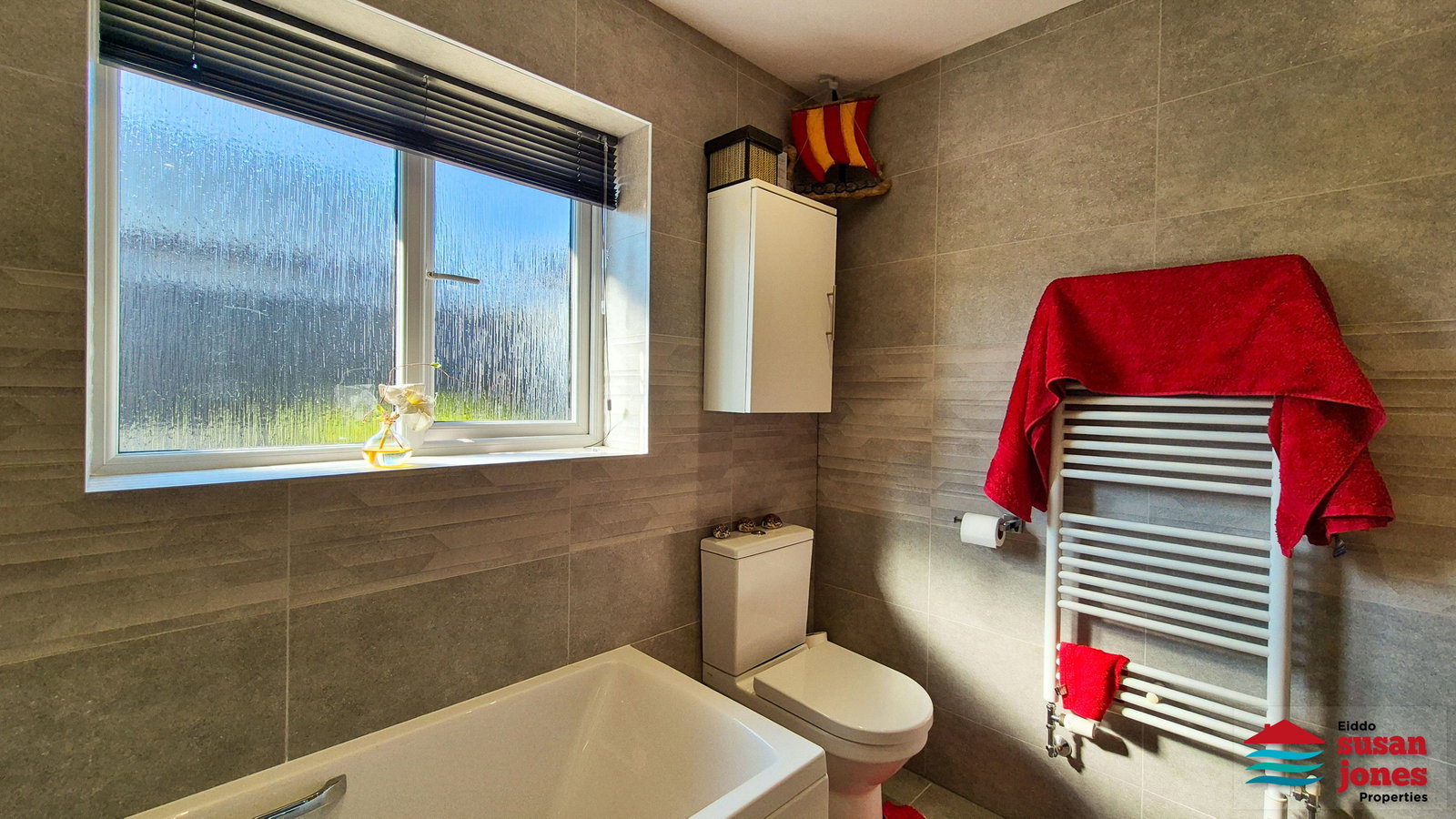 A well-appointed bathroom, filled with natural afternoon light from the uPVC double glazed window. The space features a shower enclosure with glass screen and wall-mounted rainfall shower with handheld attachment, a panelled bath, and a W.C. A stylish vanity unit with integrated wash hand basin and storage drawers combines practicality with sleek design. Tiled walls, a central heating towel rail, recessed ceiling spotlights, and an extractor fan complete the room, creating a bright, modern, and functional space.