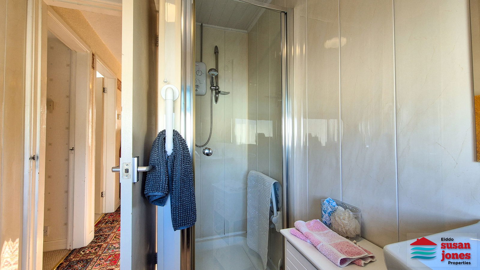 Shower cubicle with electric shower. WC. Vanity unit with washbasin and storage under. UPVC Double glazed window.