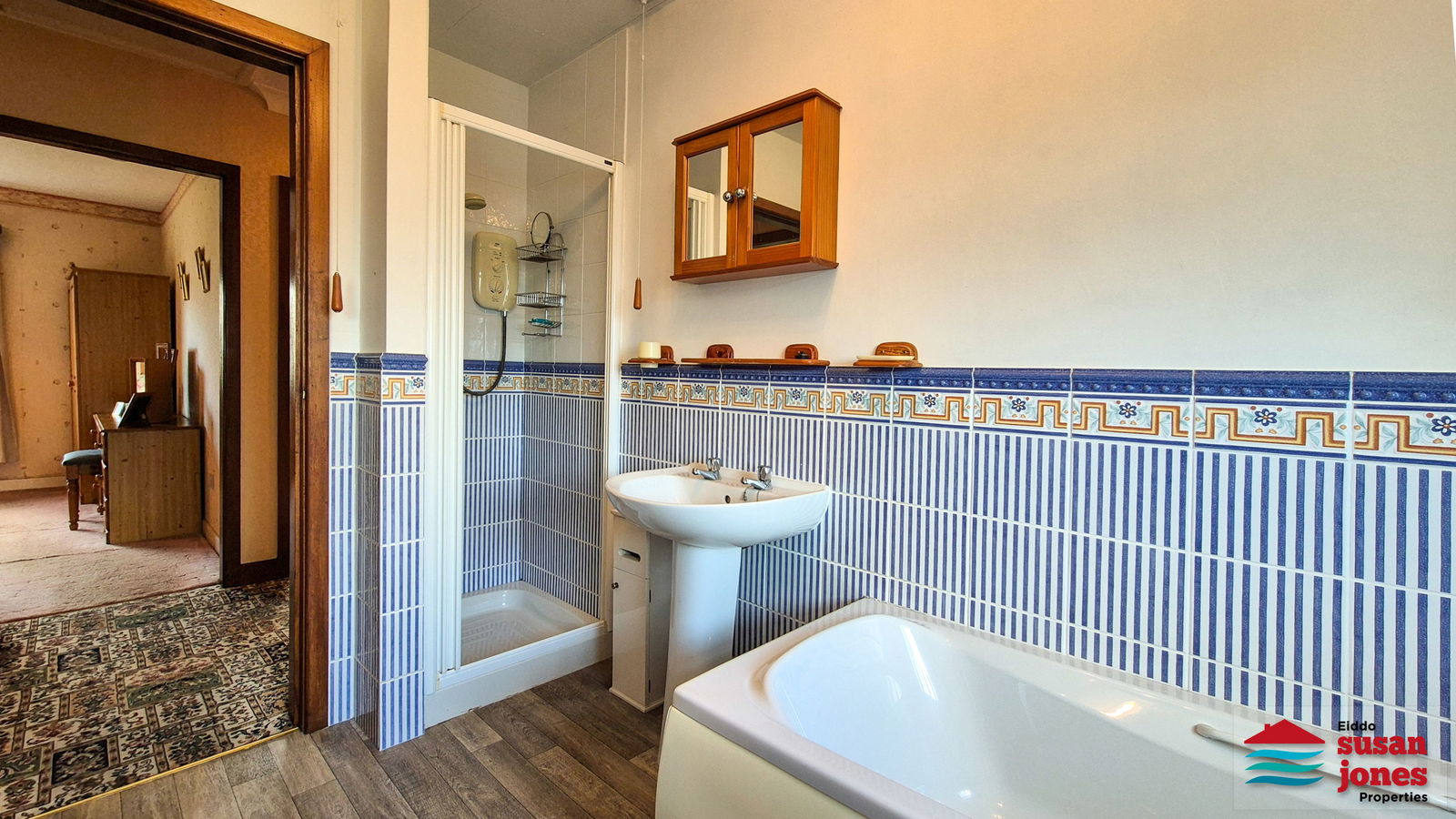 White suite with W.C., panelled bath, shower cubicle with Mira Sport electric shower. Pedestal washbasin. Radiator with towel rail. UPVC double glazed window.
